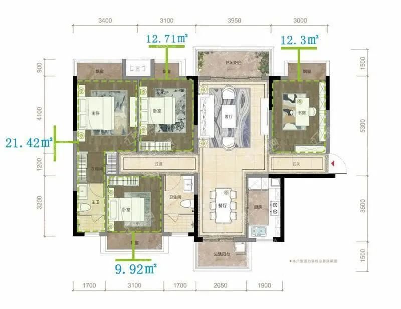 1. 全屋格局比较方正,设计合理,动静区分到位。书房独立且面积不小,方便业主灵活使用;