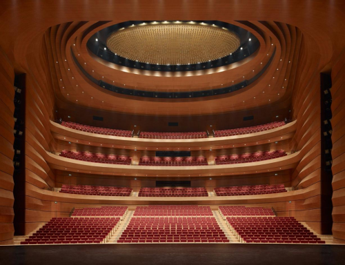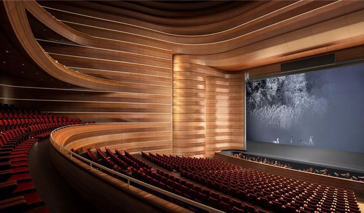 广西文化艺术中心大剧院内部为古典的马蹄形格局,用木质墙板打造了内部空间的表皮,保证出色的空间声学效果,混响时间在1.5-1.8秒之间,营造和谐完美的音乐感受和氛围。音乐厅平面设计为长六角形,室内设计构思根据流动的音乐韵律而演绎,墙面板如同起伏的缎带,有韵律地过渡到吊顶造型;音乐厅内配有64音栓管风琴,提供了从室内乐到大型交响乐丰富宽广的曲目演绎空间。多功能厅配备有电子声控设备,可以调整设置不同的混响时间;可升降舞台满足了不同剧目的舞台设计需求,无论是音乐剧、芭蕾舞剧、话剧甚至时装表演均不受限制。
