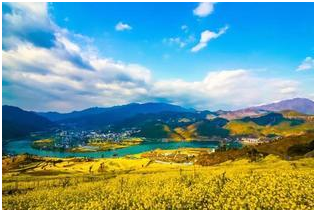 秋,素娟高挂,碧水清流渲染在丰收景致之中;