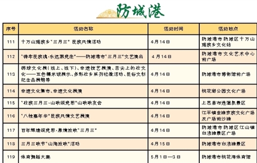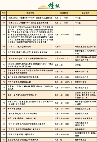 ◎姑婆山壮族风情“三月三”春游会,将安排“美在姑婆山摄影展”、祈福壮乡等特色活动。