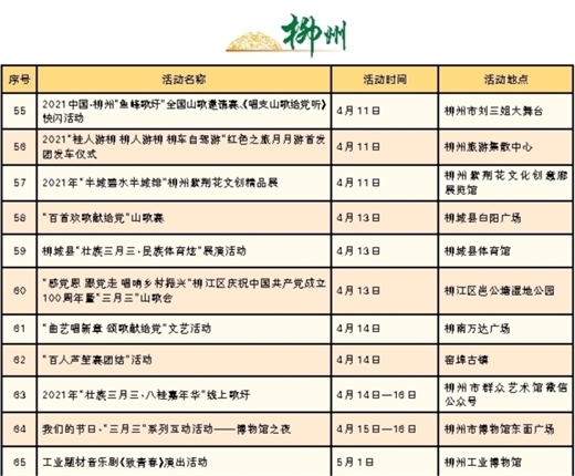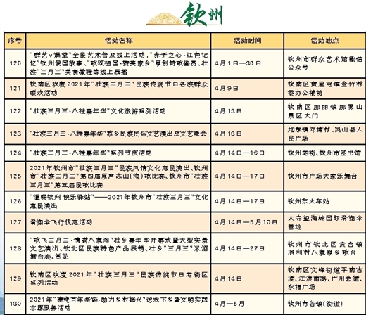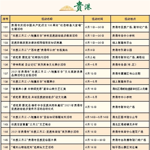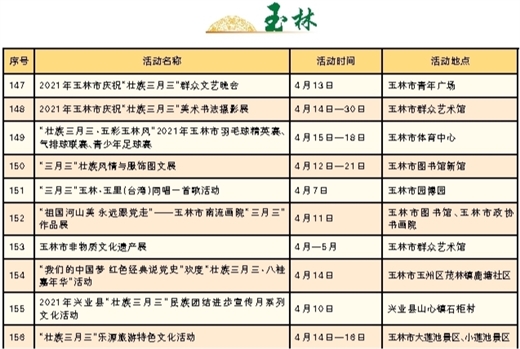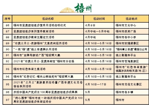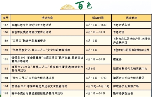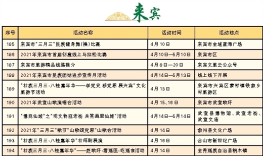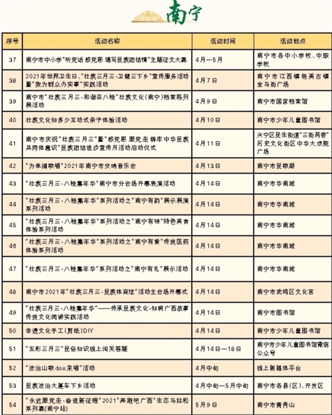 活动内容:南宁市2021年“壮族三月三·八桂嘉年华”主场活动暨第六届华南城“三月三”民俗文化节推出十大系列主题活动,演绎“壮美广西·活力南宁”!