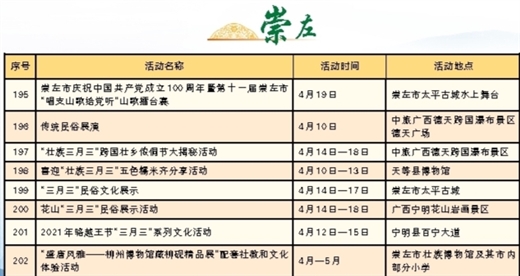 人间最美四月天,最美莫过“三月三”。很快,我们就要迎来广西人的节日“壮族三月三”啦!全区各地都有精彩的文旅活动,在南宁,“三月三”主场活动十大亮点惊艳你;在北海,海派“三月三”让你体验不一样的民俗风情;来贺州,游寿城;到崇左,探秘边关风情……这些都让我们的4天假期玩得尽兴,玩得更有意义。