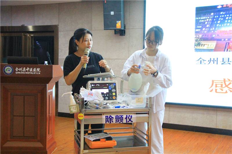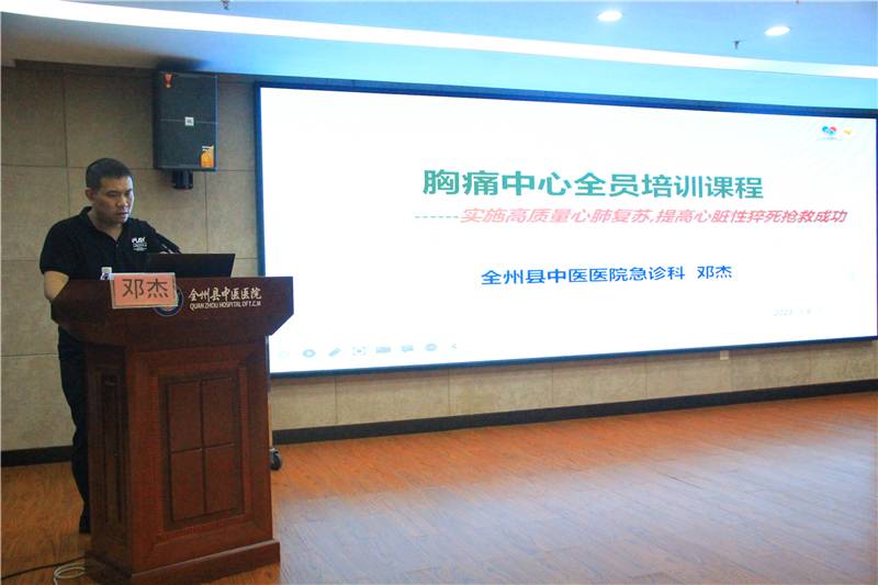 急诊科邓杰主任讲授《胸痛中心全员培训课程——实施高质量心肺复苏,提高心脏性猝死抢救成功》,与急诊科唐琼护士长现场演示心肺复苏的具体操作过程,随后新职工与中医类别助理全科医师在两位老师手把手的指导下积极参与了心肺复苏实操练习。
