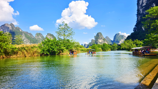 乘上竹筏,顺着明仕河缓缓前行。两岸的喀斯特峰林形态各异,与清澈的河水相互映衬,构成了一幅美不胜收的画卷,让人仿佛置身于仙境之中。