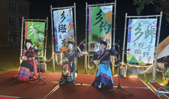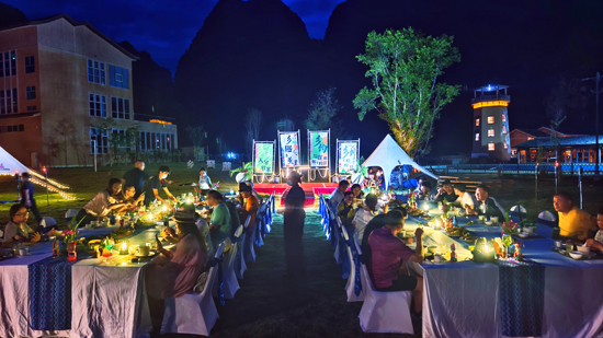 当夜幕悄然降临,草坪上的晚餐已经准备就绪。大家围坐在一起,在悠扬的山歌与天琴的弹唱中,开始品鉴美食的环节。