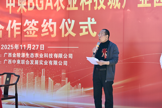 2025年11月27日,广西金陵源生态农业科技有限公司与柬埔寨高棉控股集团旗下的广西中柬联合发展实业有限公司,在南宁市西乡塘区金陵镇举行“中国-东盟(广西)中柬BGA农业科技城产业园投资合作”签约仪式。广西金陵源生态农业科技有限公司总经理陈景山出席并致辞,标志着这一总投资约8亿元的现代农业科技项目正式启动。