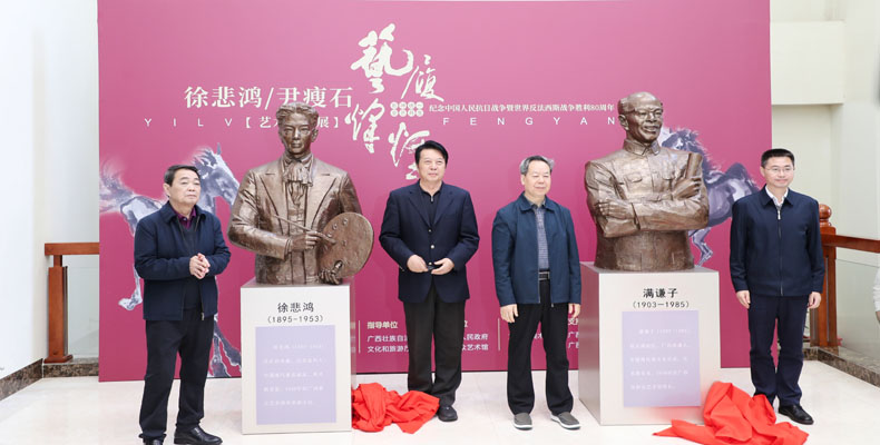 开幕式结束后,与会嘉宾共同为徐悲鸿先生及广西现代艺术教育先驱满谦子先生的雕像举行了揭幕仪式。此次展览全面呈现了徐悲鸿的经典佳作,以及尹瘦石扎根时代、富有时代印记的历史与生活画卷,共同映照出二十世纪中国艺术家在民族救亡与文化自强征程上的积极探索。