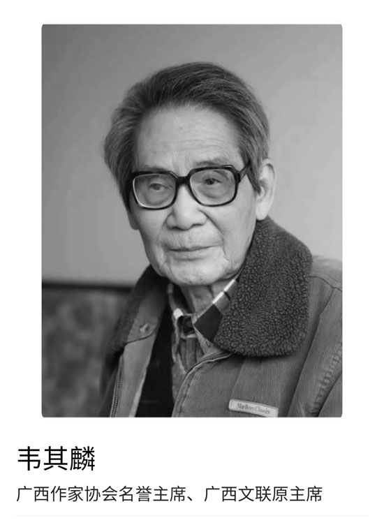 惊闻壮族著名作家、诗人,中国作家协会原副主席、广西壮族自治区文联原主席韦其麟先生仙逝,享年91岁,深感悲痛。韦其麟老先生逝世是八桂诗坛重大损失,文学桂軍失去了一位老前辈的领军人物,广西文学艺术界失去了一个优秀的领导者。悲痛之中写了这首七律,以致悼念: