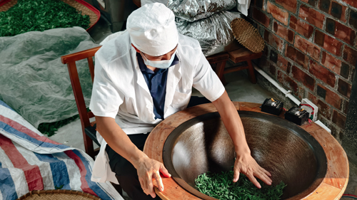 走进生产厂房,茶香四溢。公司副总经理、广西工匠胡尚军正专注杀青工序。他介绍,凌云白毫茶制作工艺严苛,5斤鲜叶才出1斤干茶,每道工序都精益求精。